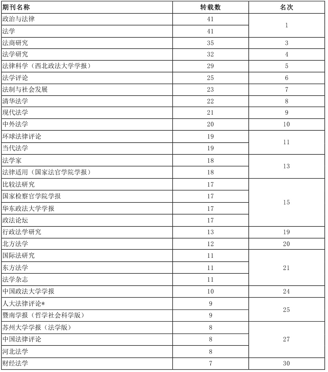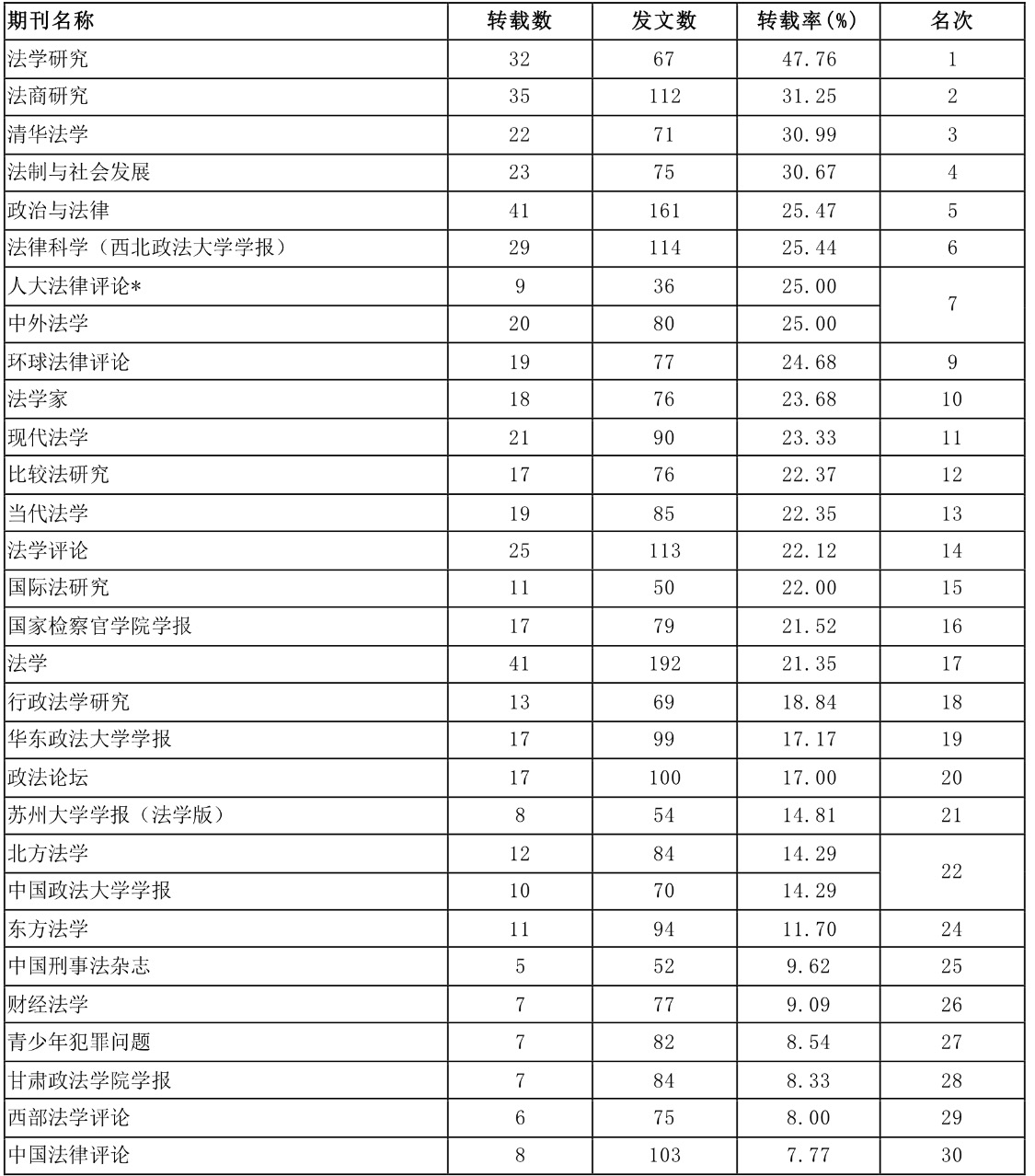 统计表明,《财经法学》2017年共发文77篇,全文转载7篇,转载率为9.09%,转载率为第26名。目前,中文社会科学引文(CSSCI)来源期刊共收录法学类期刊23种。作为2015年1月5日创办的学术期刊,《财经法学》自2016年以来连续上榜,在三年时间里取得这一成绩,是对办刊工作的重要肯定。