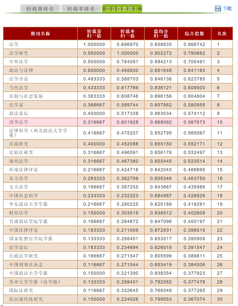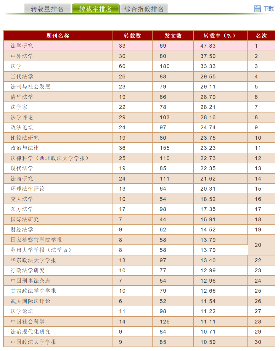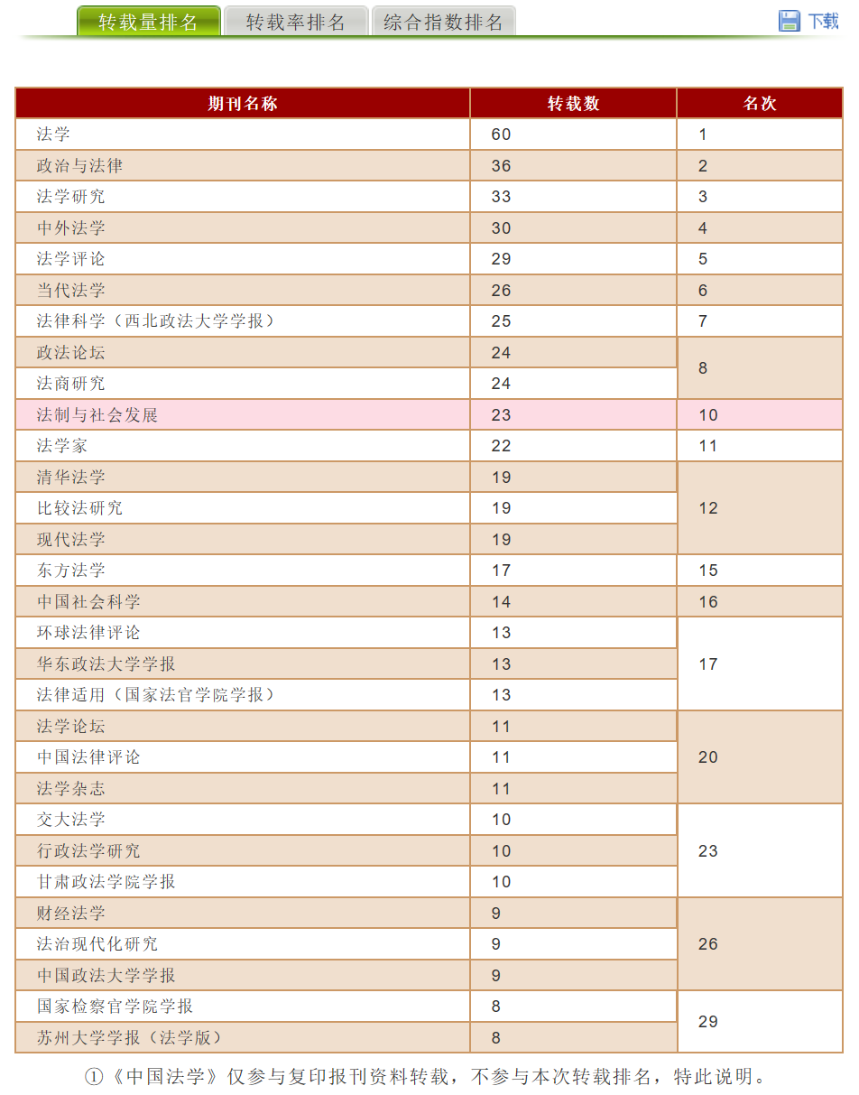 《财经法学》在复印报刊资料转载指数排名情况