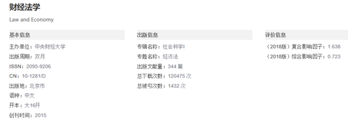 目前,CSSCI法学类期刊24种,CSSCI法学类扩展版期刊13种。《财经法学》自2015年创刊以来,五年即取得上述成绩,实属不易。这是广大作者、读者和期刊界同仁大力支持的结果。相信《财经法学》在未来一定会取得更好的成绩。