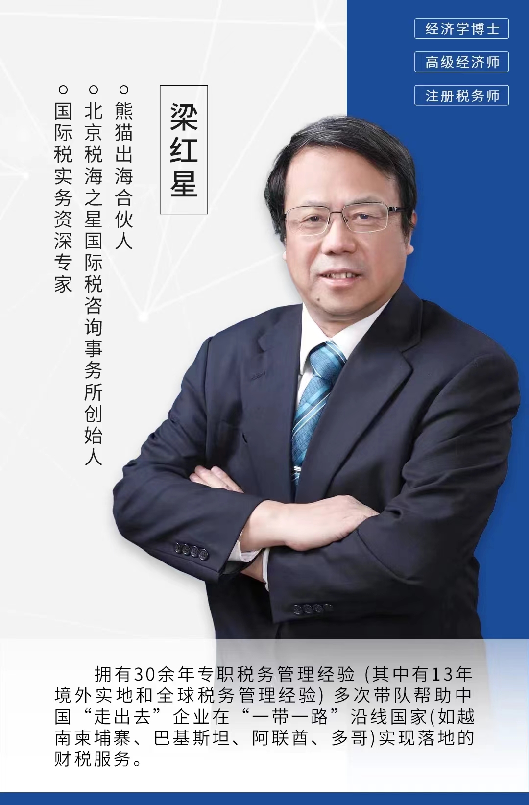 梁红星,男,工商管理博士,高级经济师,中国注册税务师。主要研究方向为“一带一路”国际税实务。涉外税务工作经验丰富,拥有30多年专职税务管理经验,曾在新疆乌鲁木齐市税务局、北京德勤、惠普、卡夫食品等单位从事税务管理工作。近13年来任职于多个成功“走出去”的中国企业,助力华为、京西重工、天合光能、葛洲坝国际等企业的海外发展,并不断积累有关海外区域实地税务管理和全球税务高层税务主管的经验,成为国内首屈一指的国际税资深实务专家。