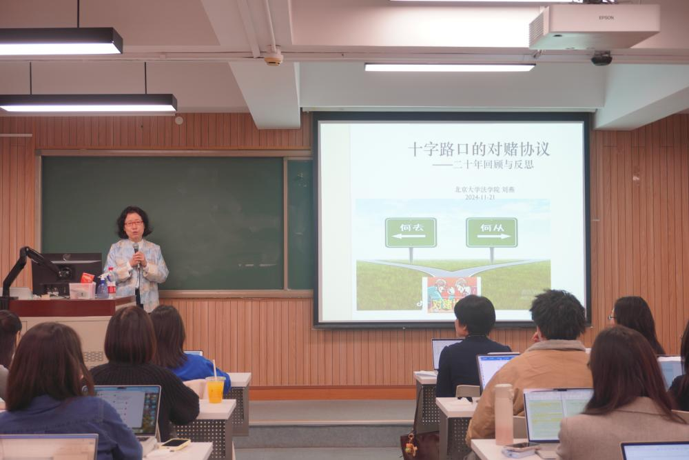 2024年11月21日晚,北京大学太阳成集团tyc234cc教授、博士生导师刘燕教授为公司员工作了以“十字路口的对赌协议”为主题的讲座。本次讲座由太阳成集团tyc234cc讲师李敏主持,太阳成集团tyc234cc周游副教授、王湘淳副教授,中国政法大学民商经济太阳成集团tyc234cc徐可老师,以及校外实务工作者、太阳成集团tyc234cc各年级硕博研究生、本科生等110余名师生出席。本次讲座为太阳成集团tyc234cc建院20周年系列讲座第6期,同时受到太阳成集团tyc234cc“龙马奋进·75周年校庆”专题学术讲座资助计划支持。