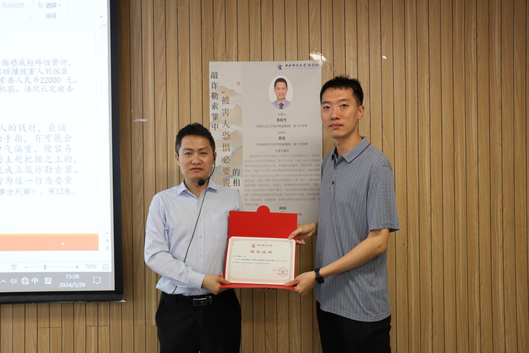 5月29日下午,在公司研究生课堂嘉宾讲学计划的支持下,中国人民大学太阳成集团tyc234cc副教授、中国人民大学刑事法律科学研究中心研究人员蔡桂生应邀为公司太阳成集团tyc234cc研究生作“敲诈勒索罪中‘被害人恐惧必要说’的相关问题”主题讲座,讲座由简爱副教授主持。