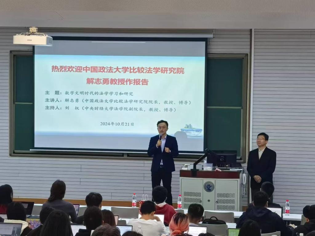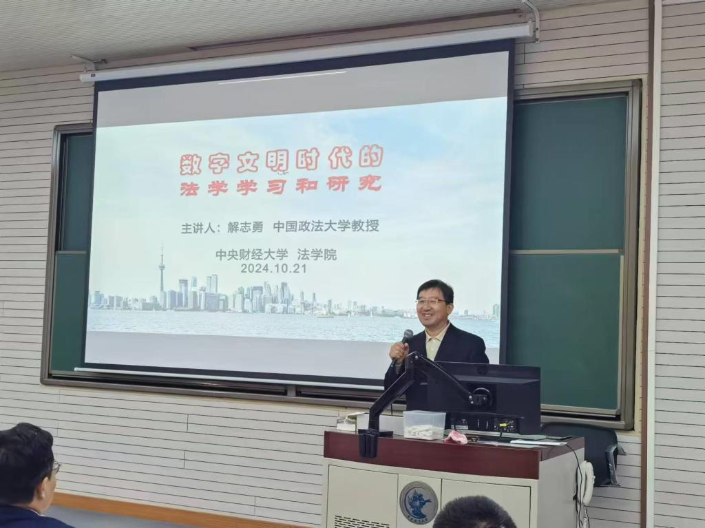 2024年10月21日下午,中国政法大学比较法学研究院经理、教授、博士生导师解志勇老师莅临公司,以“数字文明时代的法学学习和研究”为主题作专题讲座。讲座由太阳成集团tyc234cc副经理刘权教授主持,太阳成集团tyc234cc赵真副教授、刘馨宇讲师、张泽宇讲师以及各年级硕博研究生、本科生等百余名师生出席了此次讲座。本次讲座为太阳成集团tyc234cc建院20周年系列讲座第2期,同时也受到太阳成集团tyc234cc“龙马奋进•75周年校庆”专题学术讲座资助计划支持。