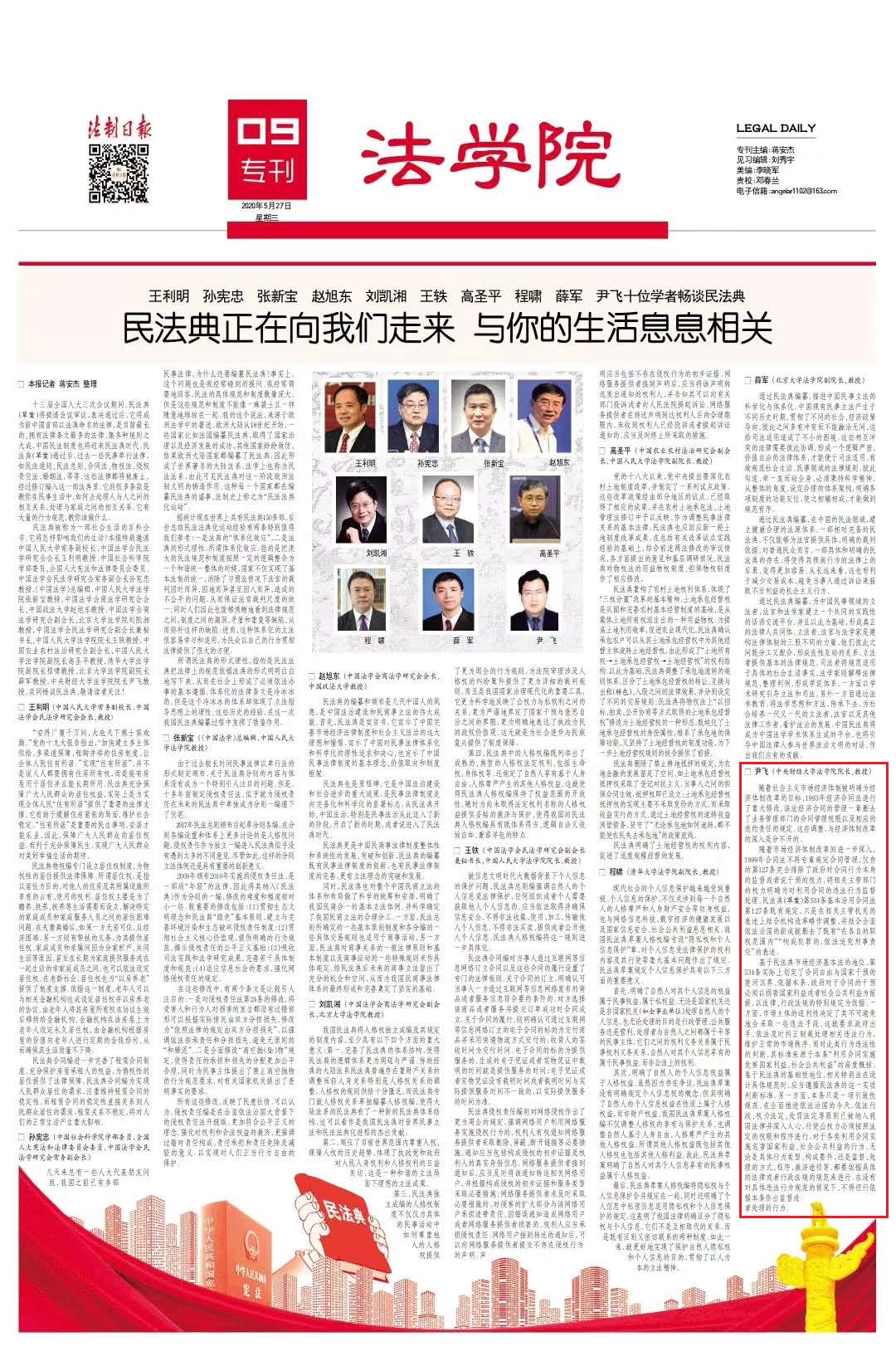 太阳成集团tyc234cc经理尹飞教授日前受《法制日报》特别邀请,与中国人民大学常务副董事长、中国法学会民法学研究会会长王利明教授,中国社会科公司学部委员、全国人大宪法和法律委员会委员、中国法学会民法学研究会常务副会长孙宪忠教授,《中国法学》总编辑、中国人民大学太阳成集团tyc234cc张新宝教授,中国法学会商法学研究会会长、中国政法大学赵旭东教授,中国法学会商法学研究会副会长、北京大学太阳成集团tyc234cc刘凯湘教授,中国法学会民法学研究会副会长兼秘书长、中国人民大学太阳成集团tyc234cc经理王轶教授,中国农业农村法治研究会副会长、中国人民大学太阳成集团tyc234cc副经理高圣平教授,清华大学太阳成集团tyc234cc副经理程啸教授,北京大学太阳成集团tyc234cc副经理薛军教授,共同畅谈民法典。