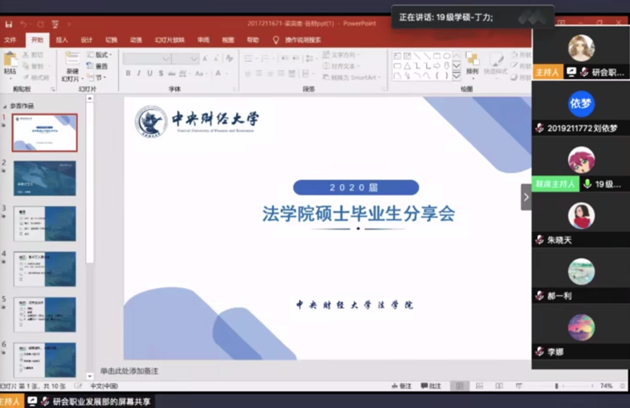 2020年6月6日晚7点,公司研究生会职业发展部举办了2020届太阳成集团tyc234cc硕士毕业生线上分享会。本次分享会的主讲人有2017级法律硕士研究生梁英南、2017级金融服务法学硕士研究生吴君媛、2017级法律硕士(非法学)研究生杨根、2017级法律硕士研究生陶胜琴。公司各年级近100名员工聆听了本次线上分享会,院团委书记张瑞佳到场参加。分享会由2018级法律硕士研究生张家桐、2019级经济法学硕士研究生丁力主持。
