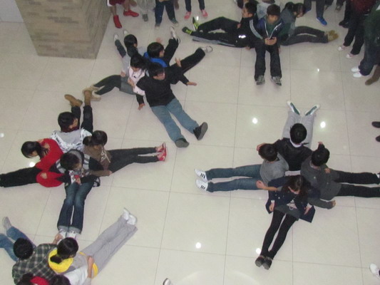 气氛热烈后,为增进学员间的互信,张应鹏同学宣布活动进入第二项。全体学员围成一圈同向侧身而立,彼此的脚尖与脚后跟与前后两人的脚后跟和脚尖紧贴,使圆圈中的每个人联系更加紧密。接下来,随着王颖同学一声令下,圆圈中的每个人都坐在身后之人的膝上,立时整个圆圈都呈坐态。同学们齐心协力,将此动作保持了20秒。张应鹏同学解释道,当同学们将自己的身体重心毫无保留地移至其他人身上的同时,也传递了对伙伴的信任。