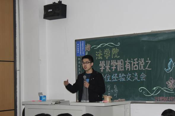主持人简洁地主持了开场仪式和介绍完三位主讲嘉宾后,本次经验交流会正式开始了。首先发言的是取得金融、法学学士双学位的经济法专业研究生向彪同学,他主要就学不学双学位、金融学学什么、金融学带来的优势、如何学习金融双学位四个方面表达了自己的看法,他强调修双学位重在坚持和深入,要学到有用的知识,不能够浮于表面。此外,他还介绍了一些学习方法供现场的同学参考,例如利用网上视频自学、旁听其他公司课程等。