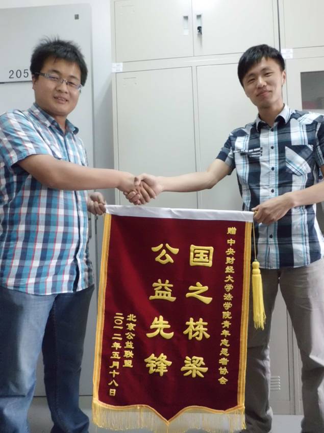 5月22日上午,残疾人代表及北京公益联盟负责人向公司送来一面绣有“国家栋梁,公益先锋”的锦旗,对公司志愿者在“圆梦故宫”志愿活动中的奉献表示感谢。院团总支书记李杰以及青年志愿者协会部长荣宏橙代表公司接受了锦旗。