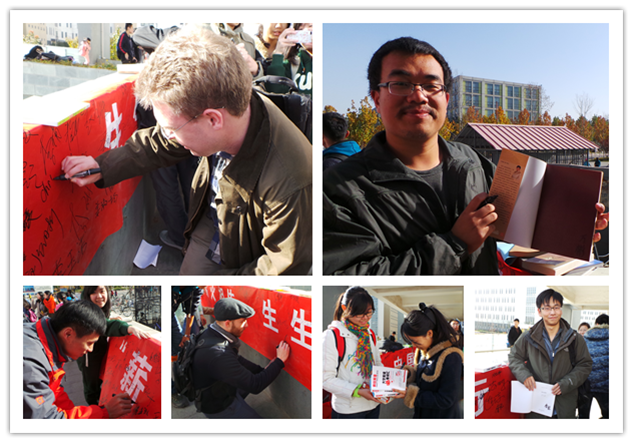 首先,为了更好地展示本次活动的主题,公司团总支员工会组织部的新干事们准备了“薪火相传,生生不息——中国梦·中学行”的横幅,并邀请公司师生在横幅上签字。组织部干事在动员过程中,为了扩大本次活动的吸引力,他们大声喊出自己设计的口号。澎湃着热情的响亮口号吸引了众多师生前来签名,现场十分热烈。很快,横幅上便写满了各式各样的签名。其中尤值得一提的是几位外教,虽然负责这本次活动的同学们在与外教的交流中存在着一些障碍,但是在他们的努力宣传下,外教都十分乐意地在横幅上签上了自己的名字,并对本次动给予了赞许。