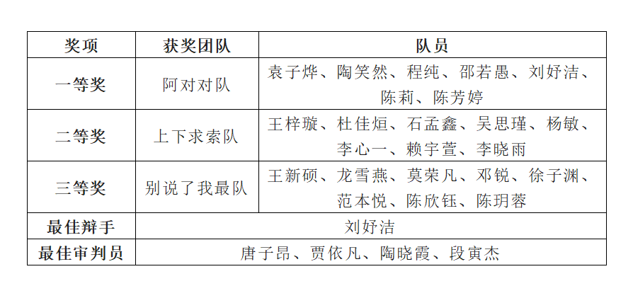 经评委评议,辩护方“阿对对队”斩获第五届模拟法庭大赛决赛一等奖,“上下求索队”荣获二等奖,刘妤洁同学荣获“最佳辩手”称号。
