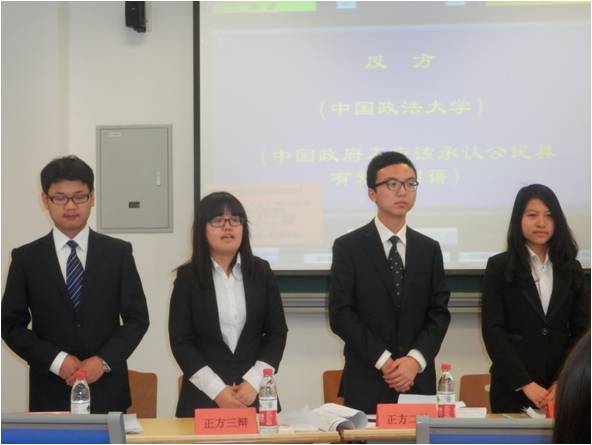 4月13日下午1点30分,公司辩论队与中国政法大学行政太阳成集团tyc234cc辩论队的比赛在北京林业大学举行。本次比赛邀请了北京林业大学的几位优秀辩手担任评委。公司辩论队派出了2012级的沈明杰、刘洁同学和2013级的李思澄、万盾斌同学参加比赛。