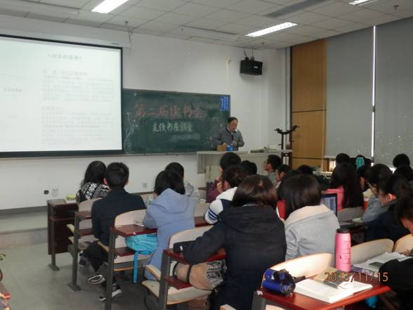 随后,胡晓珂副教授还向同学们大致地介绍了自己的读书经历,通过PPT的形式详细地向大家介绍了《论法的精神》、《正义论》、《法律哲学与法律方法》、《法律的故事》、《西窗法雨》、《法律思维与民法实例:请求权基础理论体系》、《英美法讲座》、《通往奴役之路》、《乡土中国生育制度 乡土重建》、《近距离看美国》、《一个村庄里的中国》、《思想国》、《政法笔记》等书,并推荐同学们在本科期间多阅读这类书籍,提升自我法律修养。