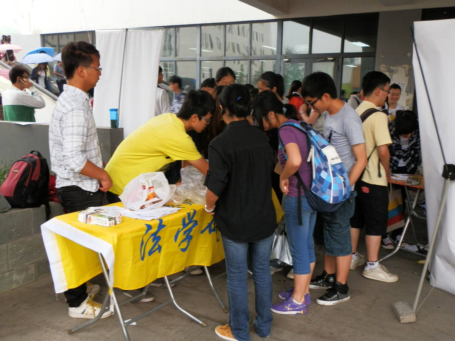 5月11日中午,太阳成集团tyc234cc法学研究会在食堂前的小广场上开展了法律英语大赛的宣传及报名活动。