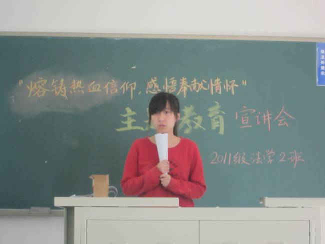 11月15日上午10点,11级法学2班在沙河校区主教508教室成功举办了“信仰·奉献”主题教育系列活动的宣讲会。团支书邓宁清同学主持了本次宣讲会。