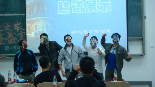 活动在团支书颜慧平同学播放了一段同学们前往中国戏曲公司学习京剧舞台动作和画脸谱的视频后拉开序幕。在“知识竞赛”环节中,通过对兼具趣味性和专业性的问题的抢答,同学们了解了许多有关京剧的知识。随后,同学们戴上自己精心描绘的京剧脸谱上台展示,中国戏曲公司的同学们则展示了他们的专业技能,唱念做打,精彩纷呈,赢得了满堂喝彩。在互动环节中,几位同学还上台向戏曲公司的同学们学习了舞棍和唱腔。活动在热情洋溢的气氛中圆满结束。