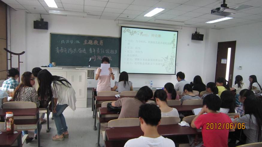 6月6日早上10点30分,11级法学二班“飞扬青春,思辨天下”时政论坛第一期在沙河校区主教509顺利举行。
