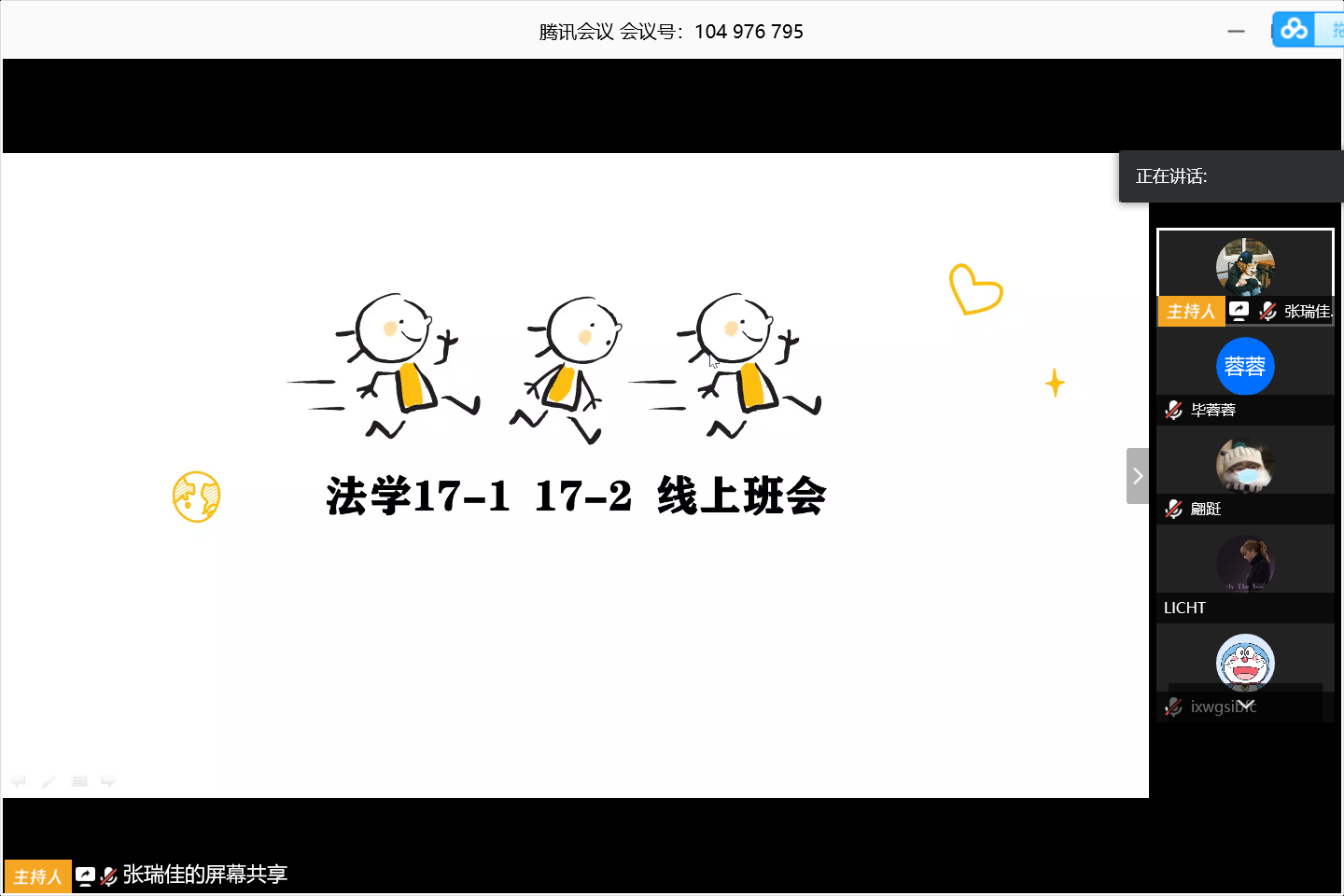 在国内疫情有所好转、同学们持有诸多疑问又渴望重回校园的情况下,2020年4月12日下午5时,辅导员张瑞佳主持召开了2017级本科生一班、二班线上班会,法学17-2班班主任郑人玮老师参加了班会。