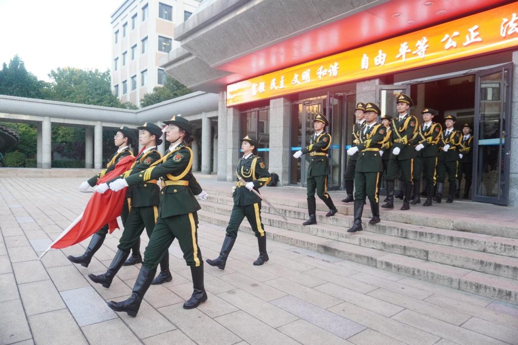 7 时整,公司国旗护卫队迈着铿锵步伐护送五星红旗入场。《义勇军进行曲》奏响,五星红旗冉冉升起,全体师生肃立行注目礼,齐唱国歌,以庄重姿态表达对祖国的热爱与崇高敬意。