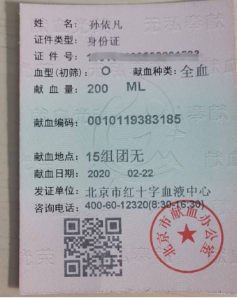 疫情防控期间,献血量受到很大影响,为努力确保特殊时期首都、武汉用血供应,团市委大学部、市学联秘书处发起“无偿献血报名征集活动”。身在北京的支部成员孙依凡同学积极响应,报名参加了献血活动。孙依凡同学表示:“前线的医务工作者在与病毒做殊死搏斗;公司和公司的领导老师,以及部分留校的同学在为疫情防控紧张工作;我的父母虽然不在抗疫一线,但是也在各自的单位参与抗击疫情的工作,非常辛苦。看到身边的人都在为战胜疫情贡献自己的力量,我也被深深感动,希望能为早日消灭疫情贡献自己的绵薄之力。”
