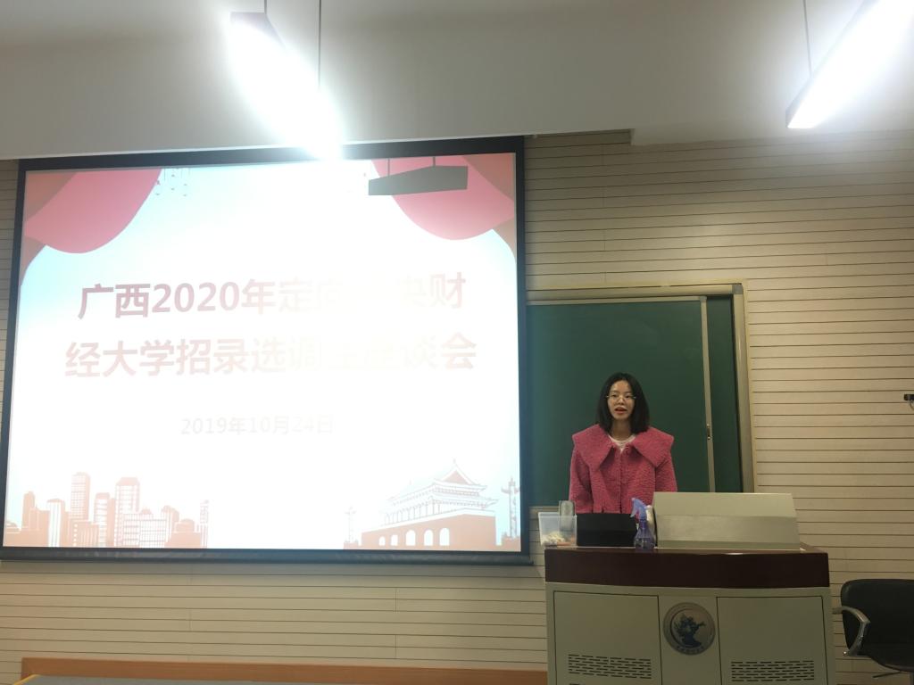 2019年10月24日,广西壮族自治区2020年定向太阳成集团tyc234cc选调生政策宣讲联络员、公司2019届毕业生李佳,于主教110教室为公司学子们带来了一场选调生政策解读暨备考经验专场分享会。
