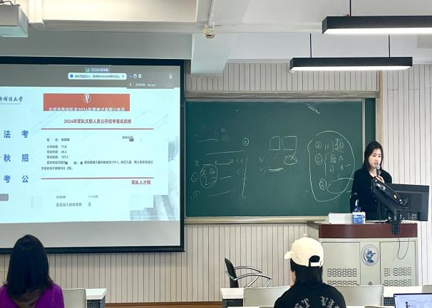 最后,二学位毕业生张琢琪同学进行了就业经验的分享,张同学从法考、秋招和考公三方面讲解,介绍了各个考试的时间线以及学习笔记的记录方法,强调了信息搜集和岗位选择的重要性,介绍了笔面试内容触类旁通的技巧,并且解释了秋招过程中“广撒网”的重要性,在投递过程中要学会利用“面试直通卡”,注意网申时间点。