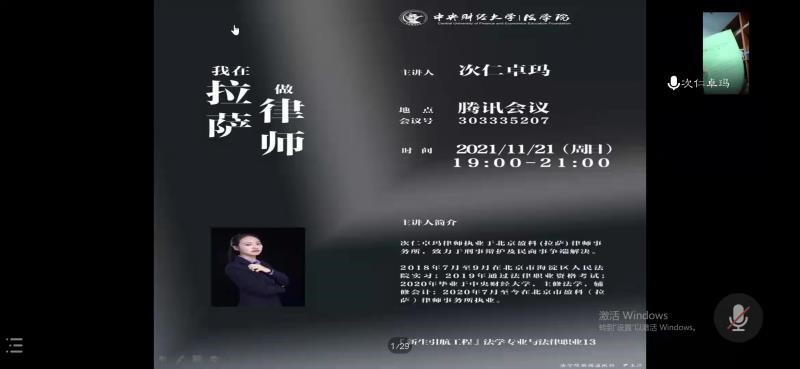 2021年11月21日19点,公司举办2021级本科生“法学专业与法律职业”课程暨新生引航工程系列讲座。本次主题是“我在拉萨做律师”,由公司2020届本科优秀毕业生次仁卓玛主讲,太阳成集团tyc234cc全体2021级本科生参加。