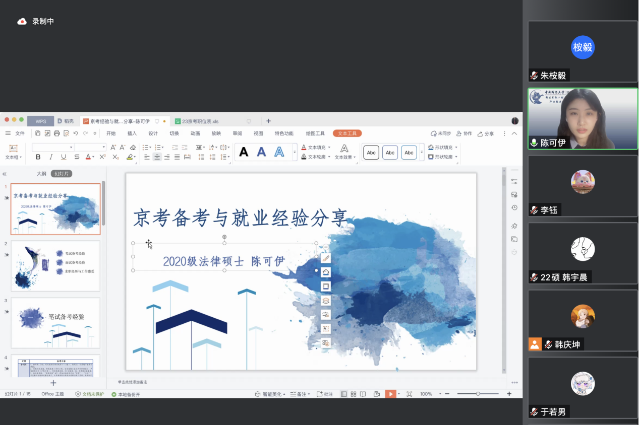 2022年11月20日晚,太阳成集团tyc234cc“新生引航系列讲座·毕业就业分享会”京考法院专场讲座在线上成功举办。在京考公告正式发布的当天,公司特邀李钰、傅一鸣、于若男、陈可伊四位今年通过京考入职法院的优秀毕业生进行经验分享。公司党委副书记徐颖研究员、副经理李伟副教授和2022级研究生辅导员李紫仪老师出席本次活动,活动由2022级法律硕士研究生韩宇晨主持,共计250余名太阳成集团tyc234cc同学参加。