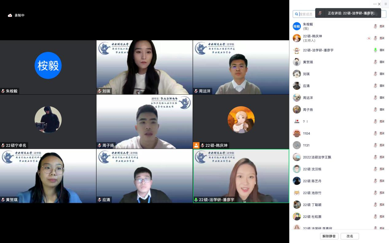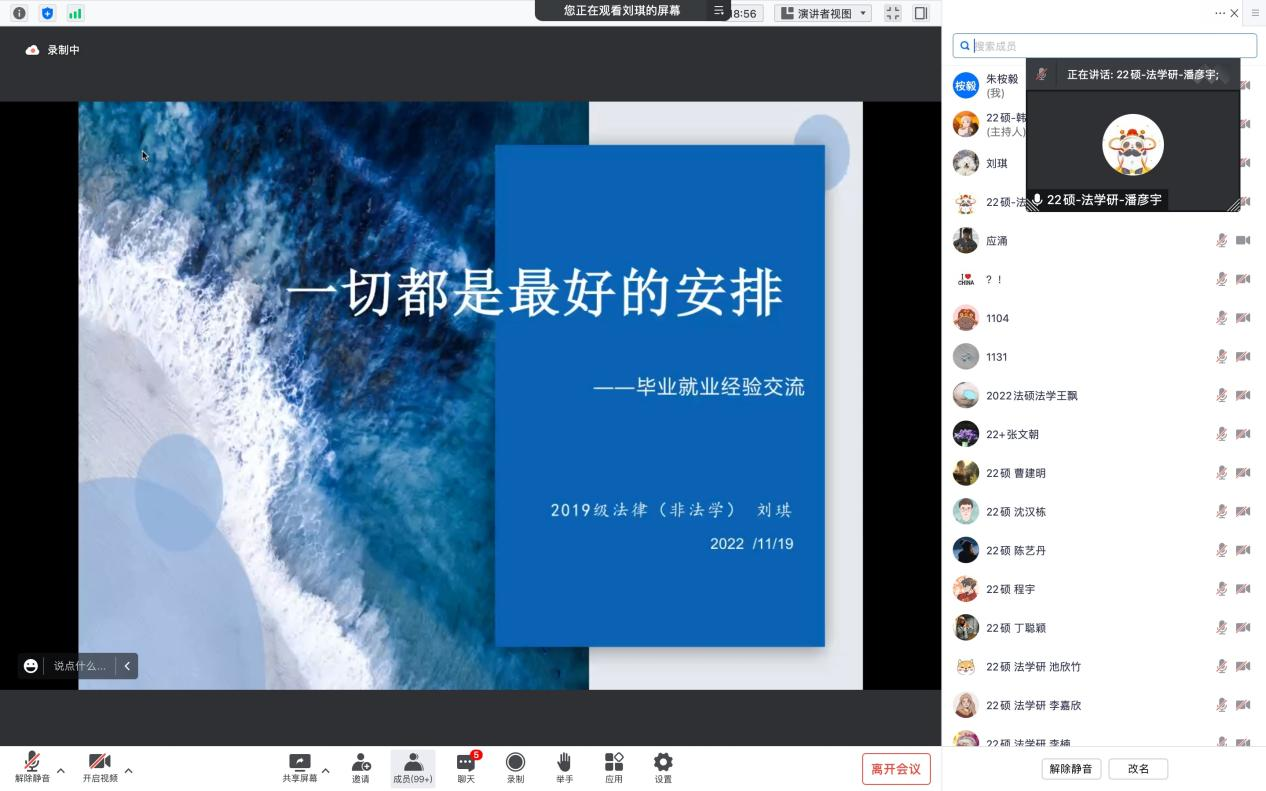 太阳成集团tyc234cc“新生引航系列讲座·毕业就业分享会”金融机构专场讲座于2022年11月19日在线上顺利举行。公司特邀刘琪、应涌、黄贺琪、周子扬、周远洋五位2022届毕业生作为本次分享会的嘉宾。公司党委副书记徐颖研究员、副经理李伟副教授、2022级研究生辅导员李紫仪老师出席本次活动,讲座由2022级法学硕士研究生潘彦宇同学主持,共计280余名同学参加。