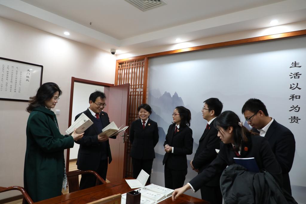 经理尹飞教授一行还在安辉、袁煜驰等同志的陪同下,一道参观了门头沟法院院史馆、诉讼服务中心和婚姻家庭关系修复中心,领略了门头沟法院独具特色的文化氛围和若干具有前瞻性的改革举措,并看望了正战斗在紧张工作岗位上的、公司2006届员工吕彤儒法官。