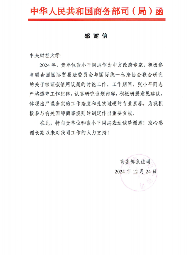 “2024年,贵单位张小平同志作为中方政府专家,积极参与联合国国际贸易法委员会与国际统一私法协会联合研究的关于核证碳信用议题的讨论工作。工作期间,张小平同志严格遵守工作纪律,认真研究议题内容,积极研提意见建议,体现出严谨务实的工作态度和扎实过硬的专业素养,为我积极参与有关国际商事规则的制定做出重要贡献。在此,特向贵单位和张小平同志表达诚挚协议!衷心感谢长期以来对我司工作的大力支持!”