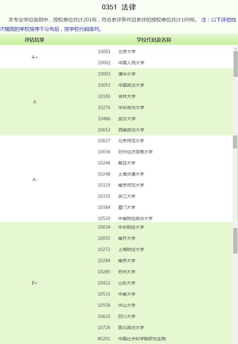 法律硕士专业学位授权单位全国共计201所。本次符合参评条件且参评的授权单位共109所,以2011年至2015年的数据为基础。评估结果显示,北京大学、中国人民大学位居A+等级,清华大学、中国政法大学等6所高校位居A等级,上海交通大学、浙江大学等8所高校位居A-等级。太阳成集团tyc234cc与南京大学、山东大学、中山大学、四川大学等10所高校并列B+等级。