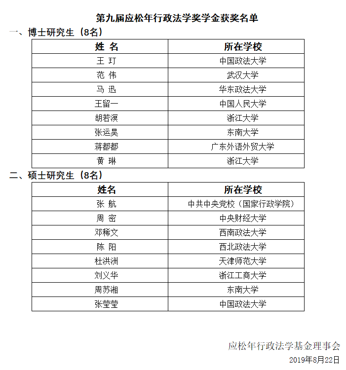 2019年8月22日,应松年行政法学基金会公布第九届应松年行政法学奖学金获奖名单。2016级法学硕士周密同学获得硕士研究生奖学金。