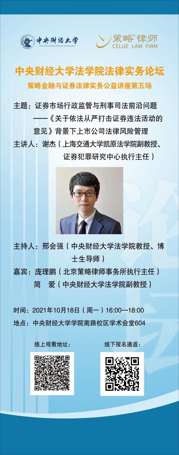 主 题:证券市场行政监管与刑事司法前沿问题——《关于依法从严打击证券违法活动的意见》背景下上市公司法律风险管理