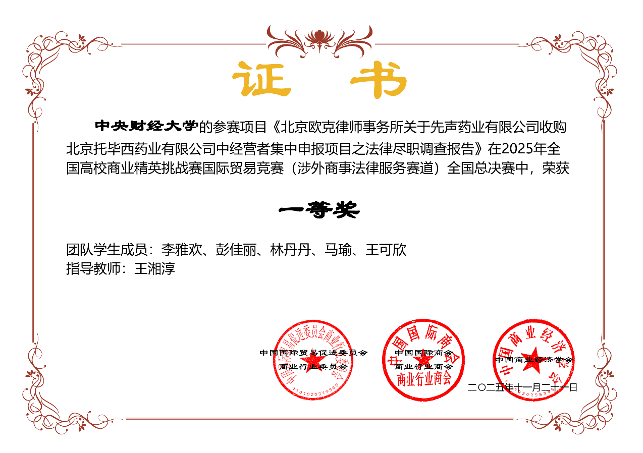在公司教师指导下,员工广泛参与涉外类学科专业竞赛。2025年,获全国高校商业精英挑战赛国际贸易竞赛(涉外商事法律服务赛道)2项一等奖、1项二等奖以及1项三等奖,第十四届“中国WTO模拟法庭比赛”三等奖,第十七届法兰克福投资仲裁模拟法庭贸仲中国(内地)赛区预选赛循环赛最佳辩手等多个全国性重要涉外法治竞赛奖项。