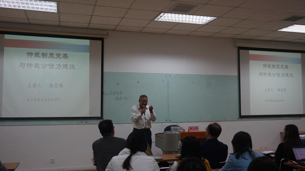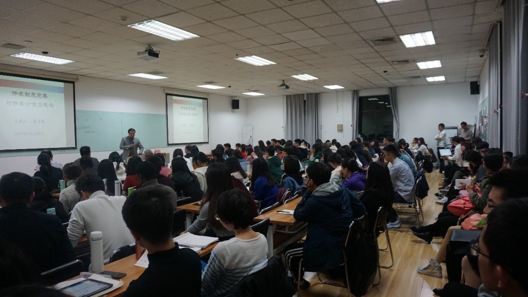 讲座主题是仲裁制度完善与仲裁公信力建设。林志炜秘书长首先以“什么是仲裁”和“谁来管仲裁”作为切入点,讲解仲裁制度与市场经济的关系,以及在市场选择机制下仲裁作为平行于诉讼的纠纷解决模式所具有的特点。结合当下仲裁领域里热议的仲裁国际化、投资仲裁、临时仲裁以及第三方资助等问题,林志炜秘书长概括地讲述了仲裁制度完善与机制创新的要求,指出仲裁公信力的建设主要责任在仲裁机构,核心要素是优秀的仲裁员,国家司法环境是重要保障。在“一带一路”背景下,提升中国仲裁公信力更在于提升我国话语权,促进我国对外经济贸易的发展,是国家软实力的重要组成部分。最后林志炜秘书长结合公信力建设,寄语法律学人,提升综合能力,做到敬业专业,具备法治理念,恪守公平公正,维护社会秩序并推动社会进步。