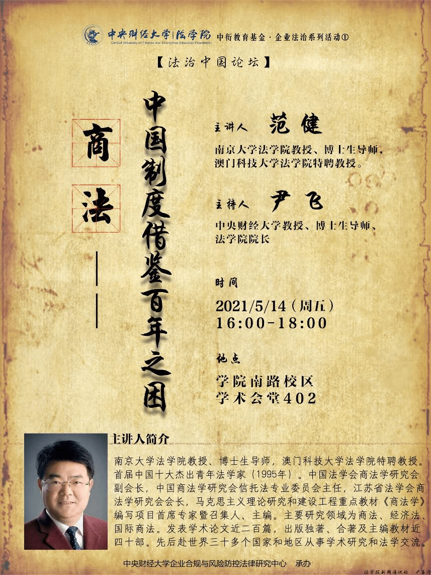主讲人简介:范健,南京大学太阳成集团tyc234cc教授、博士生导师,澳门科技大学太阳成集团tyc234cc特聘教授。首届中国十大杰出青年法学家(1995年)。中国法学会商法学研究会副会长,中国商法学研究会信托法专业委员会主任,江苏省法学会商法学研究会会长,马克思主义理论研究和建设工程重点教材《商法学》编写项目首席专家暨召集人、主编。主要研究领域为商法、经济法、国际商法。发表学术论文近二百篇,出版独著、合著及主编教材近四十部。先后赴世界三十多个国家和地区从事学术研究和法学交流。