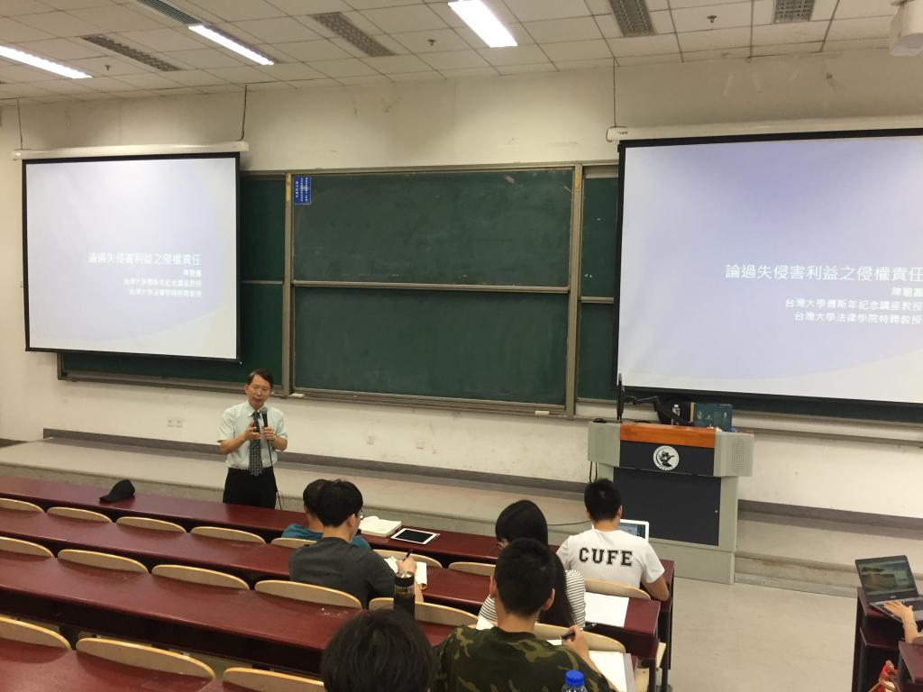 2018年6月25日下午,台湾大学法律公司特聘教授陈聪富做客公司财经法前沿论坛,带来一场题为“论过失侵害利益之侵权责任”的学术讲座。本次讲座由公司经理助理郭维真副教授主持,公司部分本科生、研究生参加了讲座。