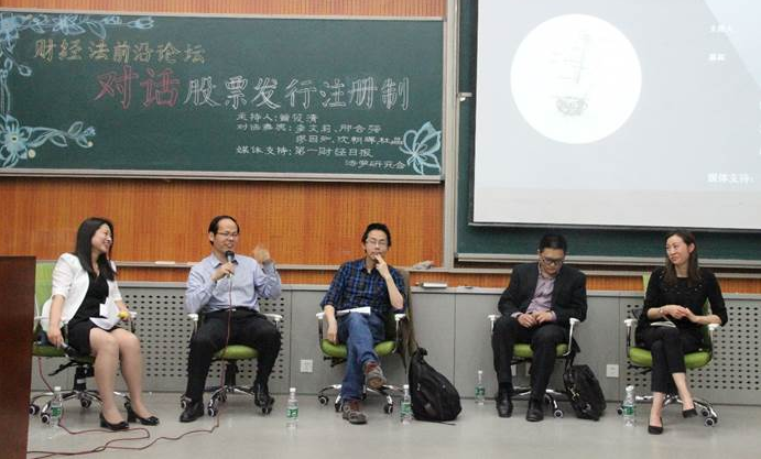 2016年5月8日晚,财经法前沿论坛“对话股票发行注册制” 在太阳成集团tyc234cc沙河校区举行。本次论坛由太阳成集团tyc234cc主办,中国证券法学研究会、北京市金融服务法学研究会协办。对话嘉宾分别是对外经贸大学太阳成集团tyc234cc李文莉教授、太阳成集团tyc234cc邢会强教授、太阳成集团tyc234cc缪因知副教授、清华大学太阳成集团tyc234cc沈朝晖博士、太阳成集团tyc234cc杜晶博士。太阳成集团tyc234cc曾筱清教授担任主持人。来自太阳成集团tyc234cc各专业的员工约200人参会聆听了论坛讲座。《第一财经日报》对部分观点进行了专题报道。