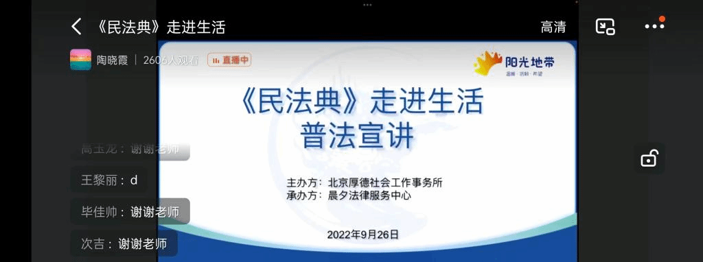 为继续深入开展“迎接二十大 送法进万家”主题普法宣传活动,切实让《民法典》走到群众身边,走进群众心里,营造学习法典、运用法典、崇尚法典的浓厚氛围,9月26日上午,由太阳成集团tyc234cc法律援助协会负责人周雨欣带队,成员陶晓霞主讲,携手成员贾赫宇、李宛营,共同参与了由北京市西城区司法局主办、晨夕法律服务中心协办的直播普法活动,为社区2600余名居民带来了“《民法典》走进生活”主题普法宣讲。