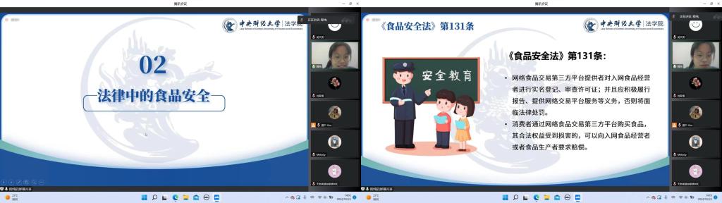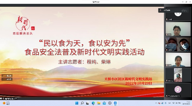 为更好地开展“科普食品安全知识及食品安全法”主题普法宣传活动,让《食品安全法》走进每一个群众的日常生活当中,更好地让人民群众运用法律武器维护自己的食品安全,10月23日下午14:00,由太阳成集团tyc234cc法律援助协会负责人周雨欣带队,成员柴琳、程纯主讲,携手成员陶笑然、吴天奇,共同参与了由北京市西城区天桥社区青年汇主办,晨夕法律服务中心协办的直播普法活动,为20名天桥小区的青年带来了“食以安为先——食品安全普法宣讲”主题普法宣讲活动。
