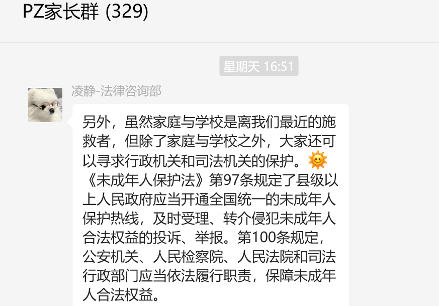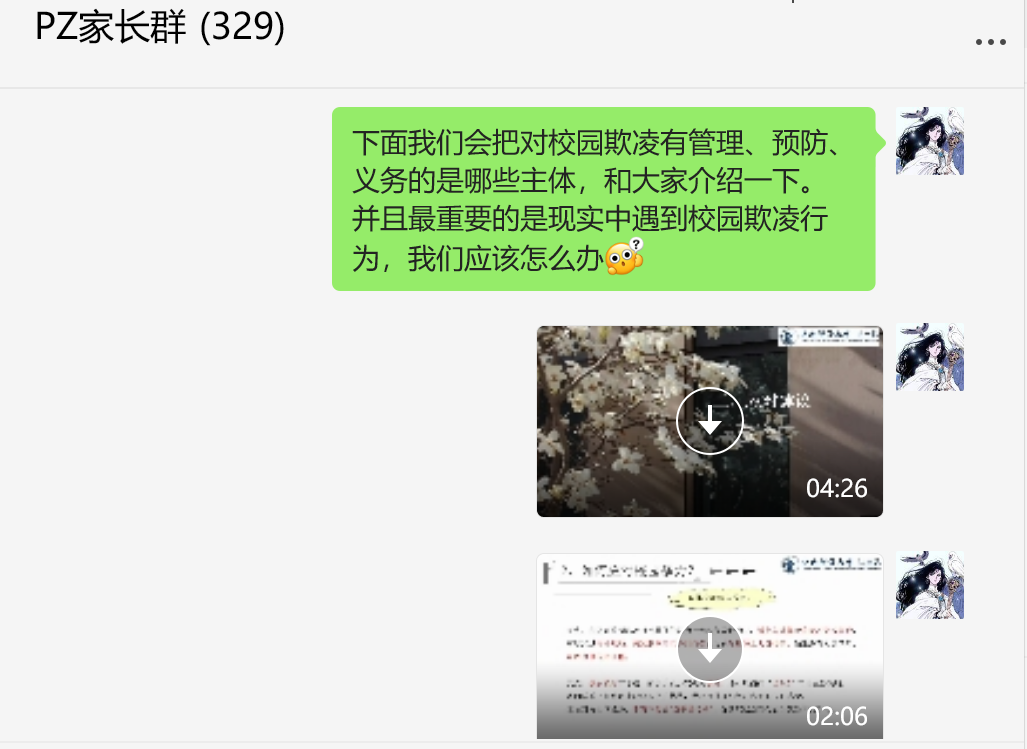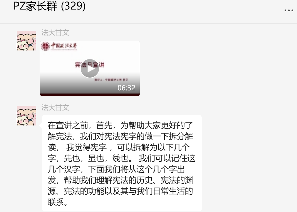 本次普法宣讲形式为线上宣讲,由两校志愿者进入社区微信群,发送自己制作的视频讲解资料,并强调和总结其中的重点内容。先由公司同学讲解未成年人校园欺凌的相关问题,再由中国政法大学的同学进行普及宪法知识的宣讲。