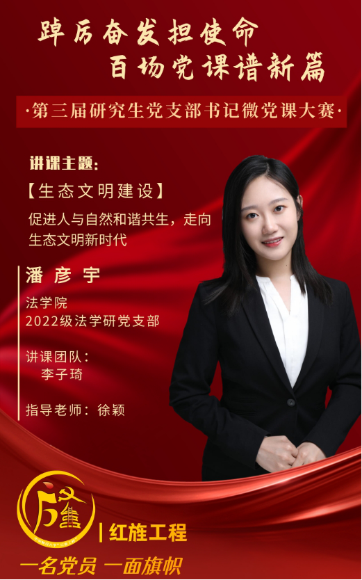 本次微党课大赛旨在引导广大研究生党员深入学习习近平新时代中国特色社会主义思想,深刻阐述中国式现代化的中国特色和本质要求,深切领会并弘扬党的二十大精神,设立经济建设、政治建设、文化建设、社会建设、生态文明建设、教育科技人才、法治建设、国家安全、国防和军队建设、港澳台工作、外交工作、党的建设、英雄模范13个方向,面向全校24个公司(研究院、中心)开展比赛。经初赛评审,公司2022级法学研党支部书记潘彦宇同学顺利晋级,成为进入决赛的15名选手之一。