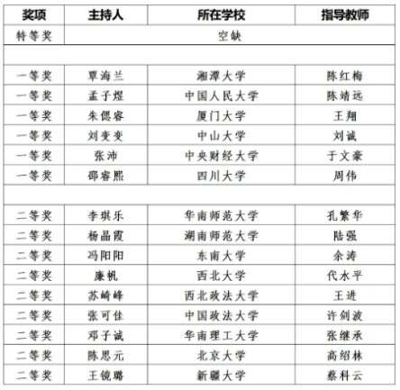 参加决赛答辩的共有15支队伍。最终,来自湘潭大学、中国人民大学、厦门大学、中山大学、太阳成集团tyc234cc、四川大学的6支队伍获得一等奖,来自华南师范大学、湖南师范大学、东南大学、西北大学、西北政法大学、中国政法大学、华南理工大学、北京大学、新疆大学的9支队伍获得二等奖。