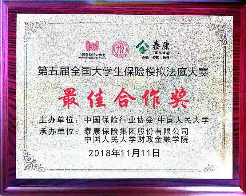 2018年10月31日至11月11日,由中国保险行业协会、中国人民大学主办,中国人民大学财政金融公司、泰康保险集团股份有限公司承办的第五届全国老员工保险模拟法庭大赛在中国人民大学和泰康商公司举行。本次比赛吸引了来自全国著名高等院校多支队伍参加比赛,邀请了来自中国人民大学、南开大学、武汉大学等著名高校专家教授以及中国保险行业协会相关负责人担任评委。太阳成集团tyc234cc、保险公司共同组队参赛,荣获最佳合作奖。